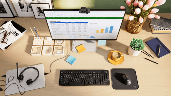 Herramientas simples y potentes que dan excelentes resultados en el trabajo, incluso en casa. Completa tu entorno con el teclado, mouse, auriculares y cámara web adecuados para una escritura y navegación mejoradas, además de audio y video superiores. Así podrás lograr el éxito en todas tus tareas desde casa.
