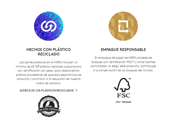 Plásticos: Mínimo 77 % de material reciclado posconsumo 2Excluye plástico del conjunto de cableado impreso (PWA), micrófono, cable y empaque.