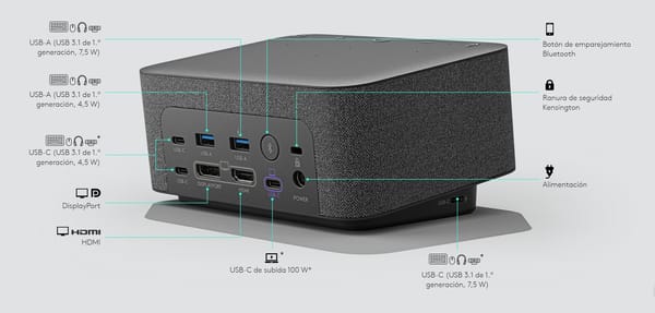 Estación base USB-C todo-en-uno con controles para reuniones y sistemas manos libres